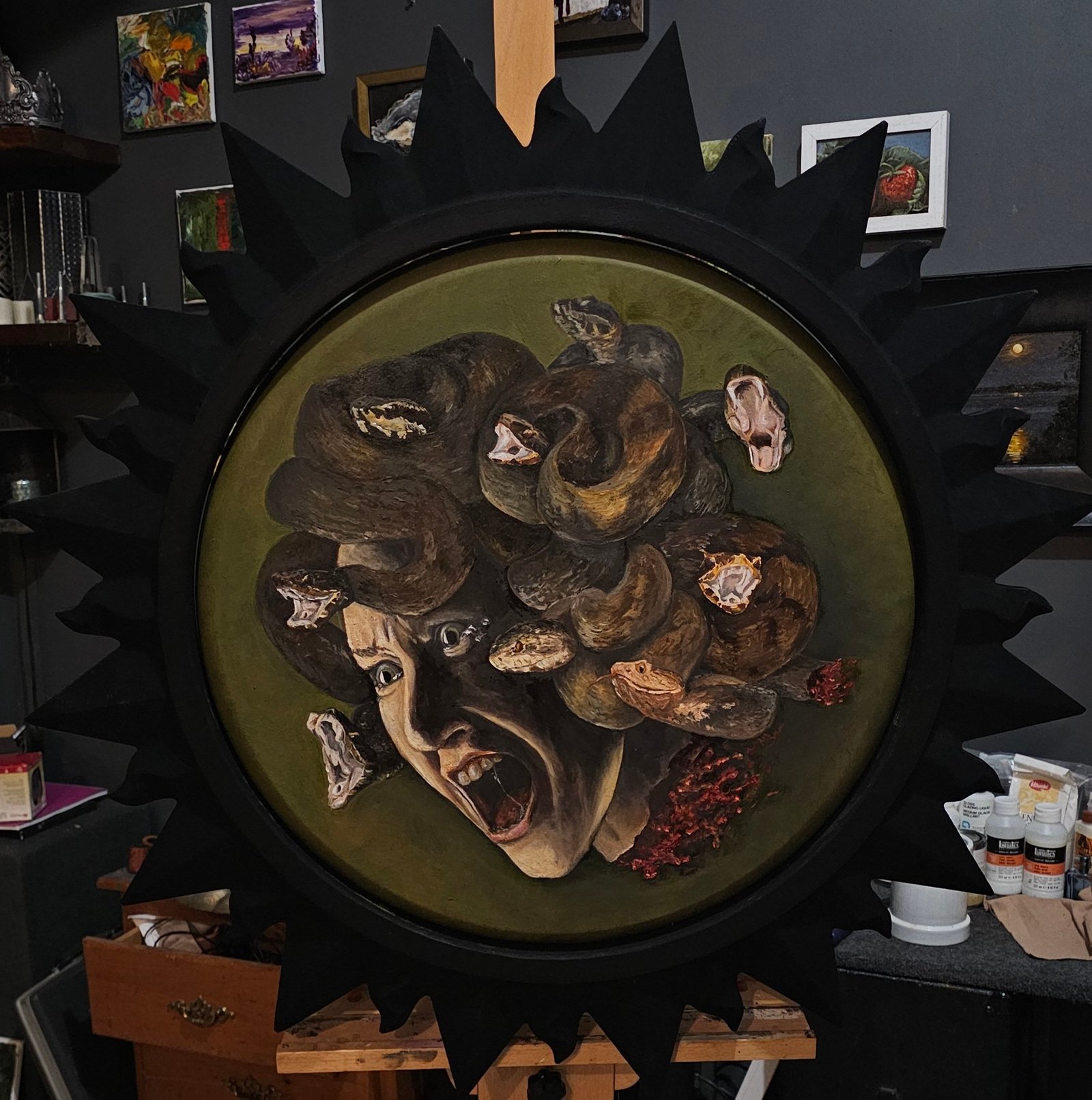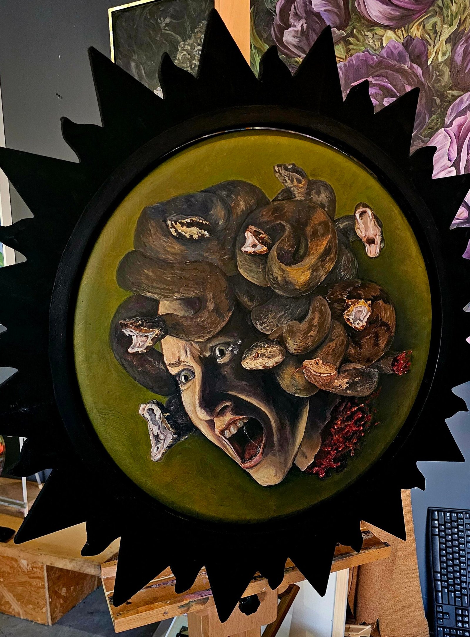 Medusa painted on custom circular canvas 24″ Oil on canvas painted by Matthew m Bishop. not an original idea however its and original interpretation